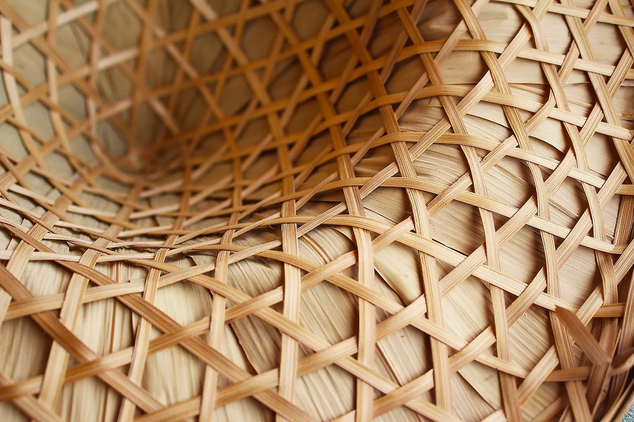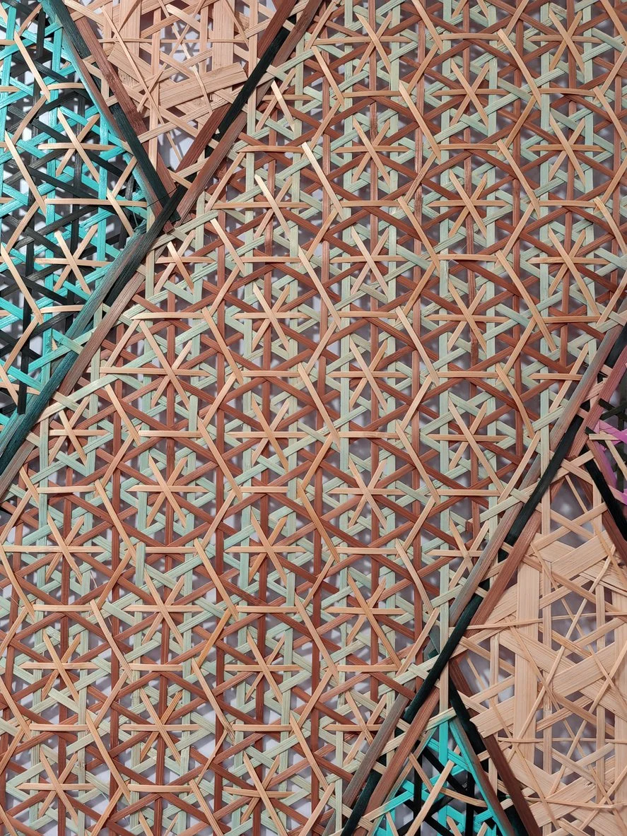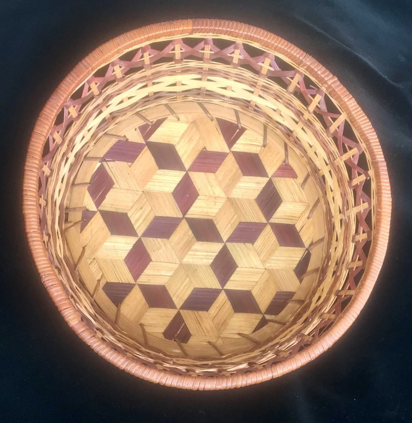 As in typical bi-directional weaving, patterns in the tri-directional Hex Weave can be entirely regular or manipulated for visual effect or 3’Dimensional shaping. Mad Weave works up well using elements that are flat strips; ribbon, cut paper, strips of cloth or bamboo. Traditionally, hexagonally woven items are found round the world as flat mats & wall panels, as well as shaped things like basketry & headgear.